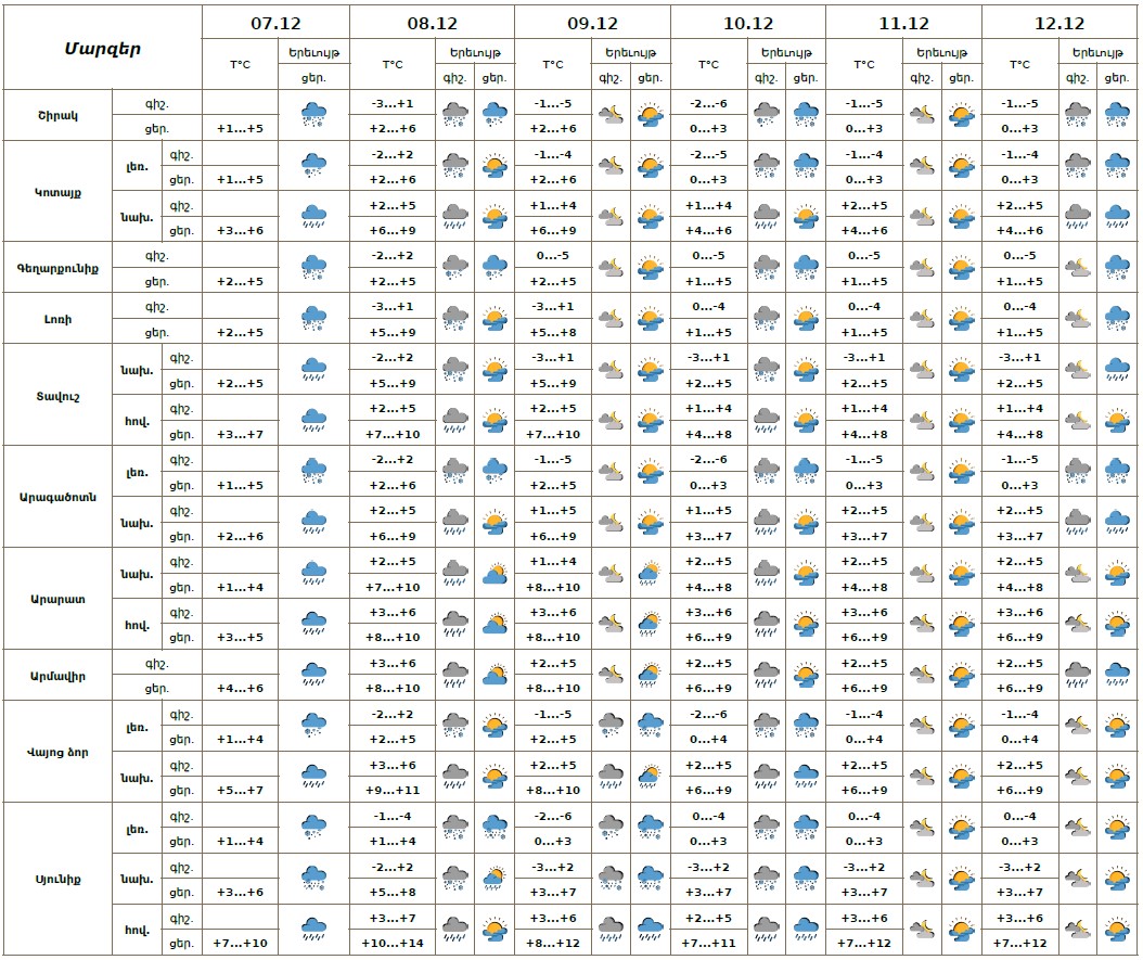 Հանրապետության տարածքում դեկտեմբերի 7-ի ցերեկը, 8-ի գիշերը շրջանների զգալի մասում, 9-10-ին, 12-ին առանձին շրջաններում սպասվում են տեղումներ՝ լեռնային և առանձին նախալեռնային շրջաններում ձյան և ձնախառն անձրևի, հովտային շրջաններում՝ անձրևի տեսքով: Դեկտեմբերի 7-ի ցերեկը և 8-ի գիշերը առանձին հատվածներում տեղումները կլինեն առատ։ Դեկտեմբերի 11-ին սպասվում է առանց տեղումների եղանակ։