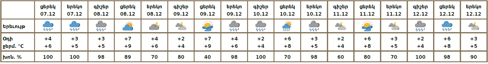 Երևան քաղաքում դեկտեմբերի 7-ի ցերեկը, 8-ի գիշերը, 9-ի երեկոյան, 10-ին, 12-ին սպասվում է անձրև։ Դեկտեմբերի 8-ի ցերեկը, 9-ի գիշերը, 11- ին սպասվում է առանց տեղումների եղանակ։ Այս մասին հայտնում են Հիդրոօդերևութաբանության և մոնիթորինգի կենտրոնից։