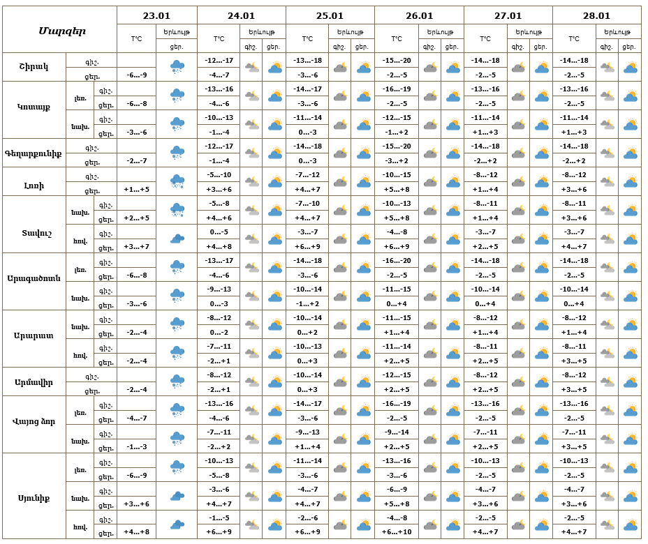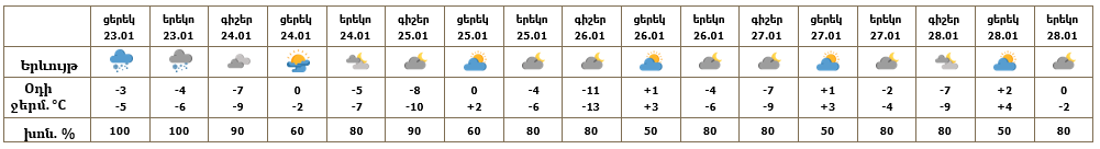 Երևան քաղաքում հունվարի 23-ի ցերեկը սպասվում է ձյուն: Հունվարի 24-28-ը սպասվում է առանց տեղումների եղանակ: