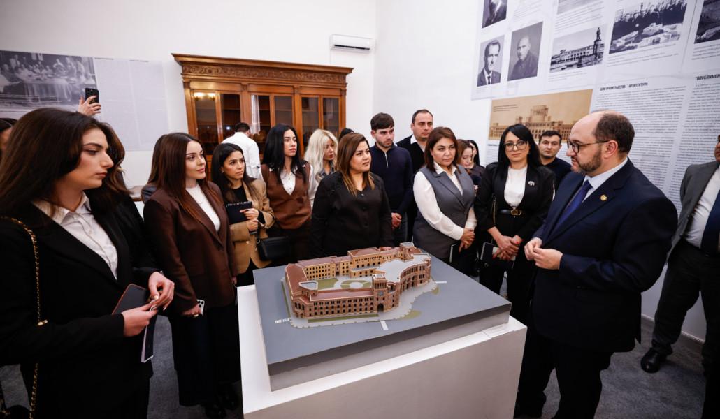 Հանդիպման ավարտին ուսանողներն Արայիկ Հարությունյանի ուղեկցությամբ շրջայց են կատարել և ծանոթացել Կառավարության շենքի պատմությանը: