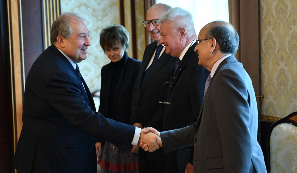 Поддержи А1+!Президент Республики Армения Армен Саркисян принял прибывшую по его приглашению в Армению делегацию “Фонда Всемирного лидерства”(Global Leadership Foundation), в составе которой: постпред США при ООН Томас Пикеринг, экс-президент Швейцарии Мишелин Кальми-Ре, заместитель Генерального секретаря ООН по миротворческим миссиям Херве Ладсус, а также директор по проектам Фонда Амитав Банерджи.