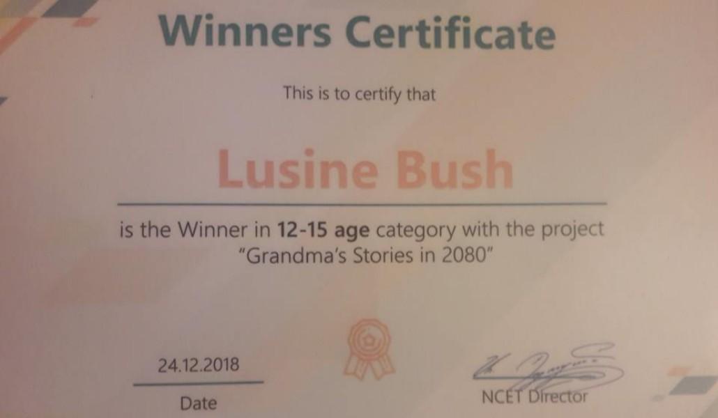 Преподавательница английского языка Ереванского образовательного комплекса “Мхитар Себастаци” Лусине Буш, в числе других участников проекта, была награждена за отличное участие в проекте “Grandma'S Stories in 2080 “ .