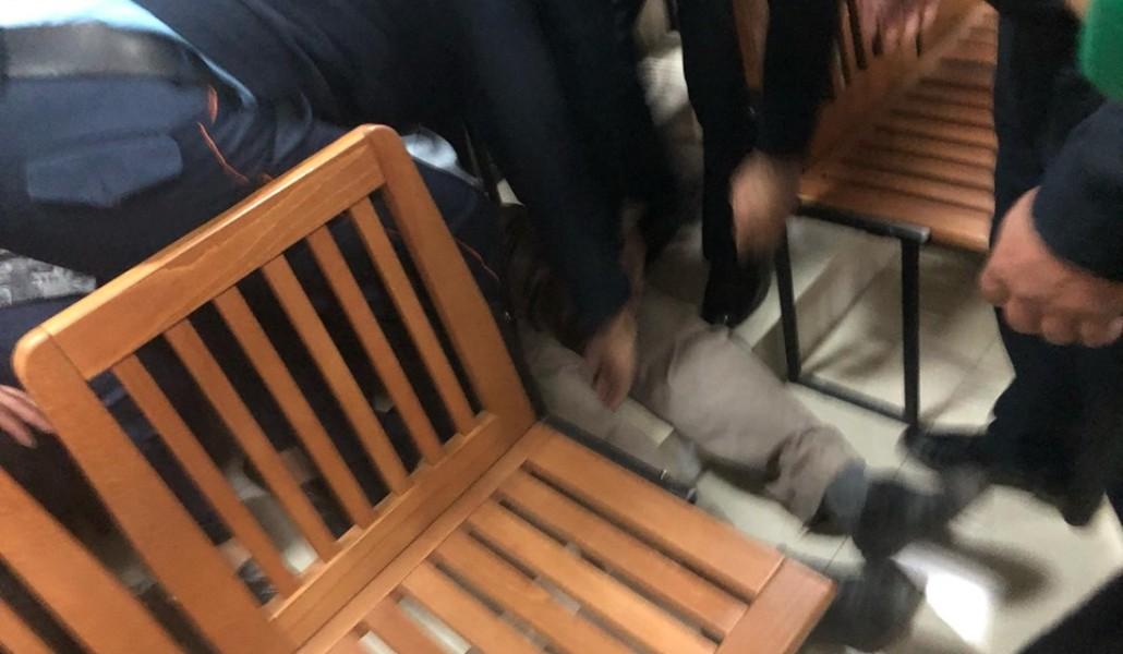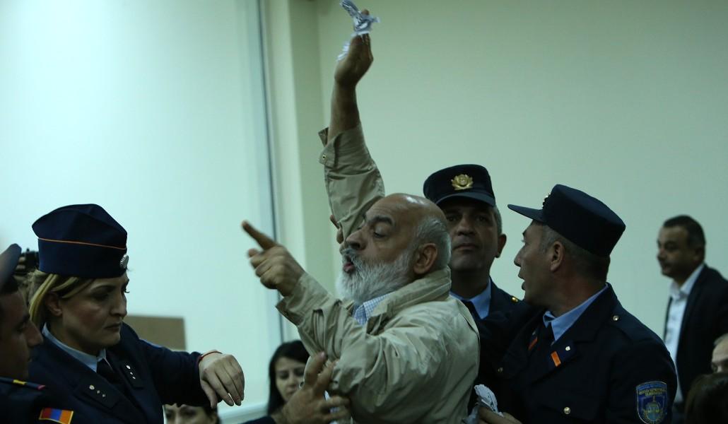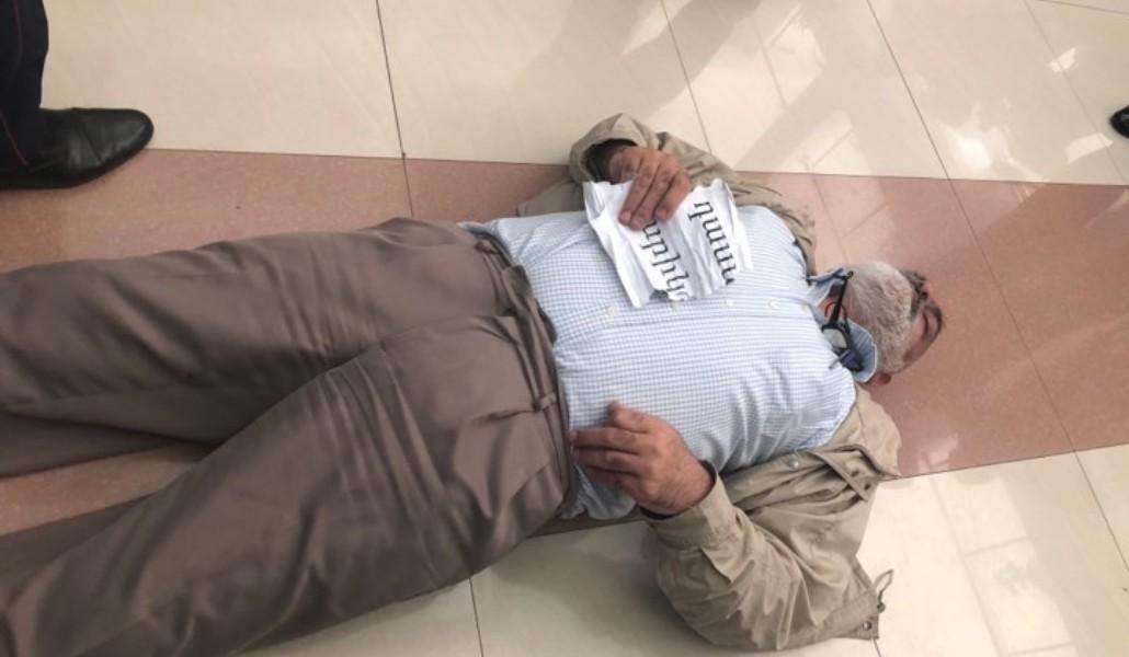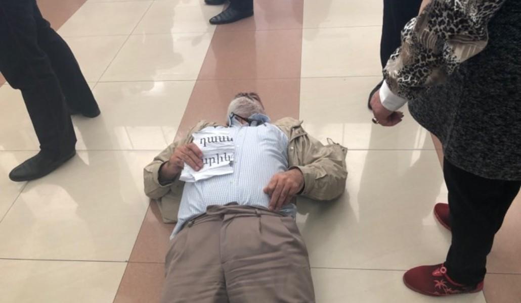 Активист Вардгес Гаспари вошел в зал суда с плакатами. Когда его попытались вывести, в знак протеста, он лег в зале суда.