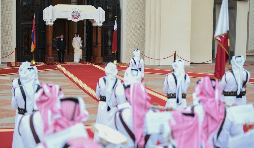 У входа в диван Армена Саркисяна приветствовал эмир Катара Тамим бин Хамад Аль Тани. Прозвучали гимны Республики Армения и Государства Катар. Президент Армен Саркисян в сопровождении эмира Тани совершил осмотр почетного караула.