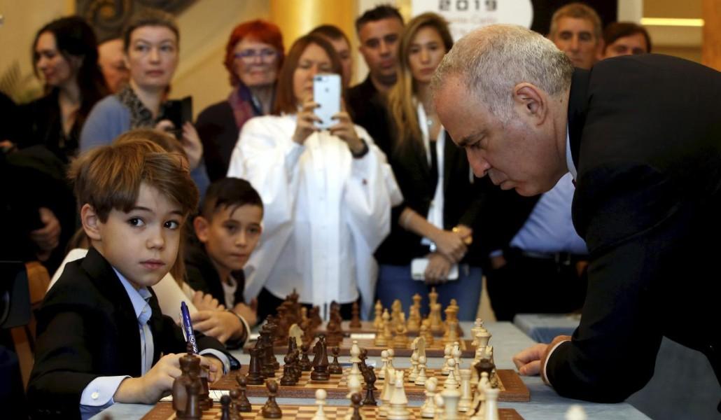 А 13-й чемпион мира по шахматам среди мужчин Гарри Каспаров, пока женщины боролись за очки, в Монако провел одновременные партии с детьми.