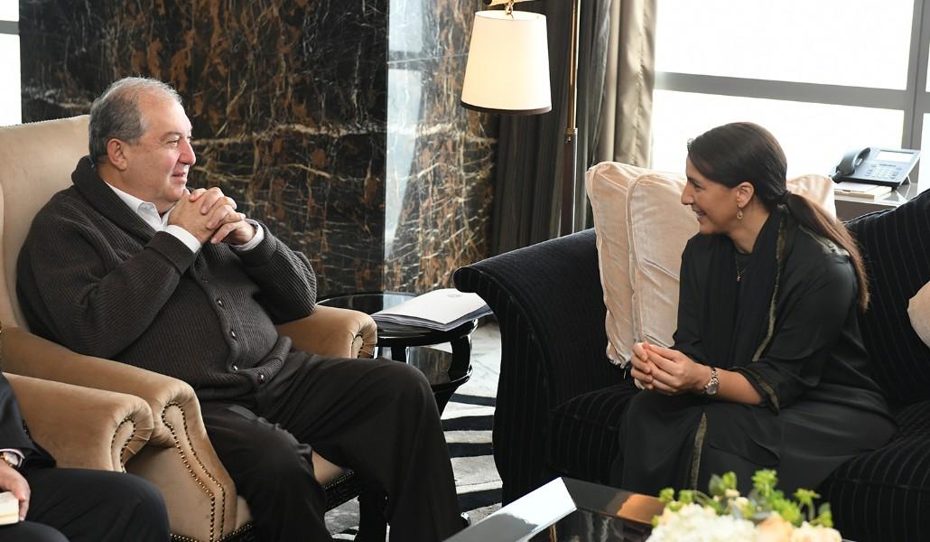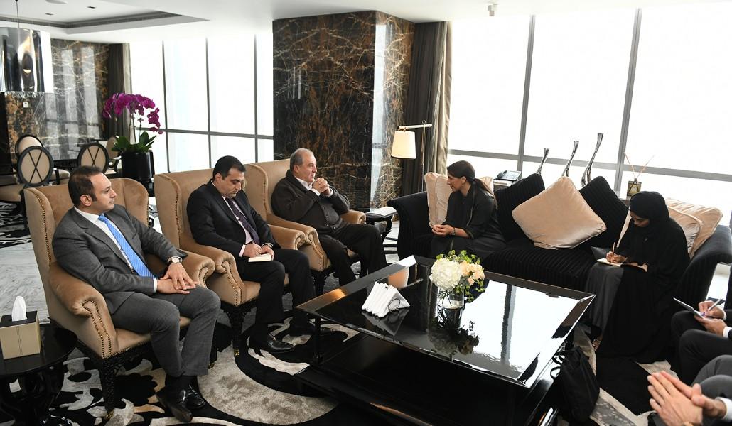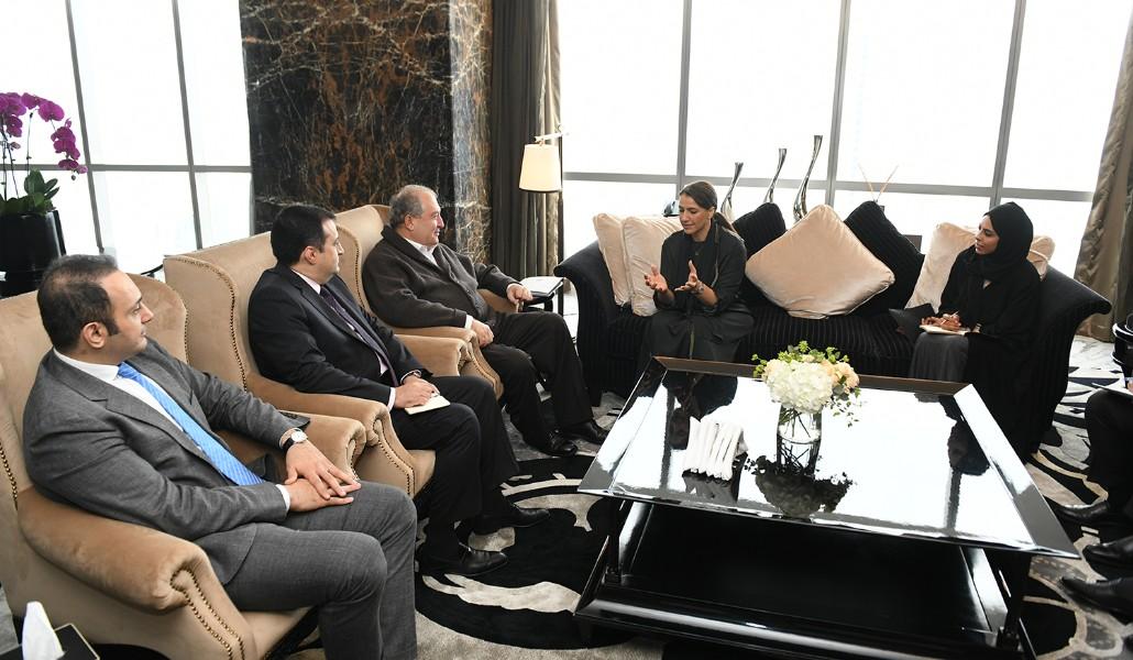 Поддержи А1+!В рамках рабочего визита в Объединенные Арабские Эмираты президент республики Армен Саркисян встретился с государственным министром безопасности продуктов питания ОАЭ Мариам Аль-Мухейр.