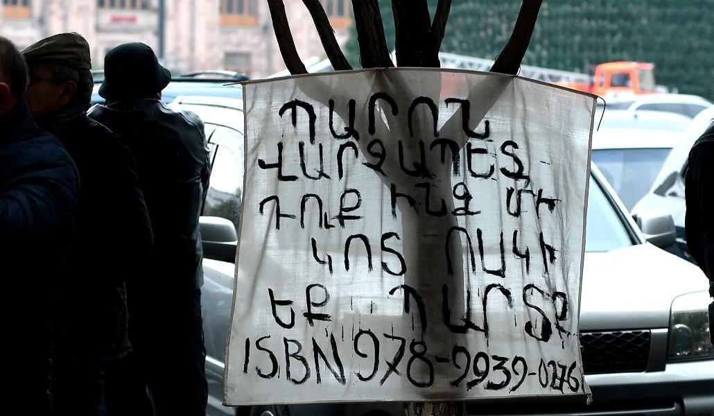 Мкртчян отметил, что в декабре прошлого года купил книгу из книжного магазина. На вопрос журналиста, какое отношение имеет запись на плакате, висящем на дереве, к происшествию, переводчик ответил, что премьер-министр вчера сделал заявление, что “если какой-либо государственный чиновник допустит кражу, лапки отрежем”: “Я поймал на лжи”.
