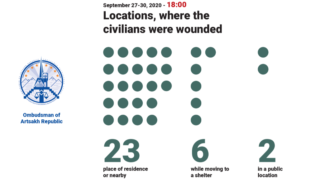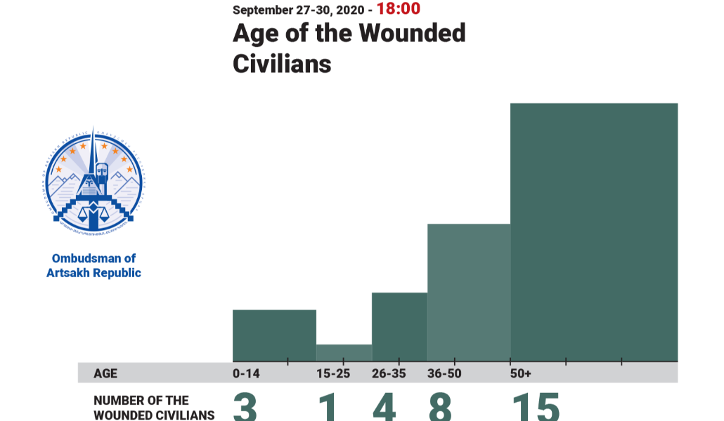 В Степанакерте и его окрестностях телесные повреждения получили 10 человек, в райцентре Гадрут – один человек, в селе Тагасер – трое человек, в селе Вардашат – один человек, в райцентре Мартуни – пять человек, в селе Спитак Шен – один человек, в райцентре Мартакерт – один человек, в окрестностях села Магавуз – четверо человек, в селе Неркин Оратаг – два человека, в селе Матагис – один человек, в городе Карвачар Шаумянского района – двое человек.