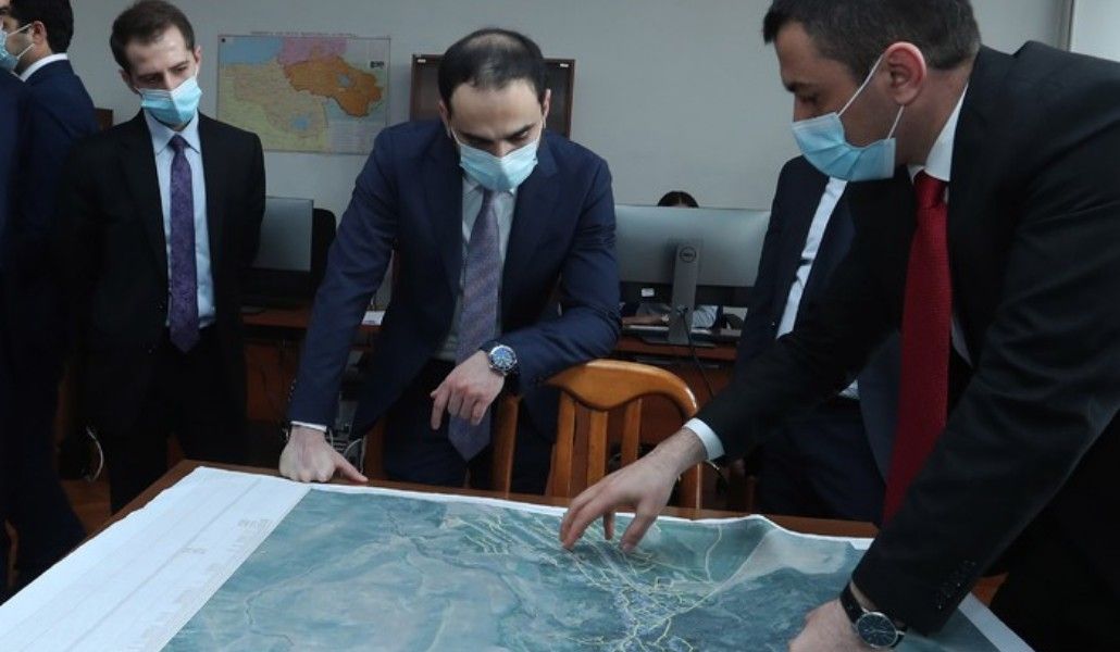 Сурен Товмасян представил вице-премьеру результаты работы Комитета кадастра, в частности, подробно остановившись на зарегистрированных в отдельных сферах изменениях, включая внедрение механизмов подготовки пакетов измерений, повышения качества обслуживания и экономии времени, а также увеличение эффективности работ. Глава Комитета кадастра выделил вопросы инструментов отчетности, расширения географии онлайн-сервисов, отметив, что за 7 месяцев 260 общин уже перешли на онлайн-управление. Сурен Товмасян также представил процесс корректировки карт и текущие результаты, отметив, что существующий инструментарий позволяет выявлять существующие проблемы и отклонения, вносить исправления в процессе определения границ и адресов населенных пунктов.