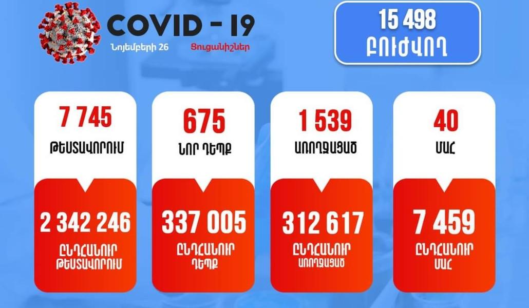 Поддержи А1+!По состоянию на 11:00 26 ноября в Армении подтверждено 337,55 случаев заболевания коронавирусом, из которых 312 617 выздоровели, а 7 459 умерли.