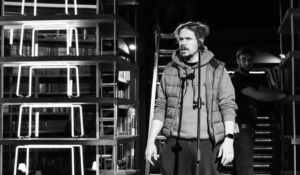 Единственное, в нашем случае нам было важно, чтобы он стоял – таким образом сохраняется узнаваемая параллель с юмористическим стендапом. Нам удалось найти потрясающую локацию для съёмок. Всё, что вы видите в кадре: полукруг из книжных полок, зеркальные колонны с натуральным деревом, латунными вставками и атлантами - это реально существующий интерьер. В прошлом очень модный ночной клуб, который мы специально немного подсветили и адаптировали под съёмки нашего проекта. Достроили декорации: у нас появилась полукруглый подиум, а также в зале появились столики с лампами.