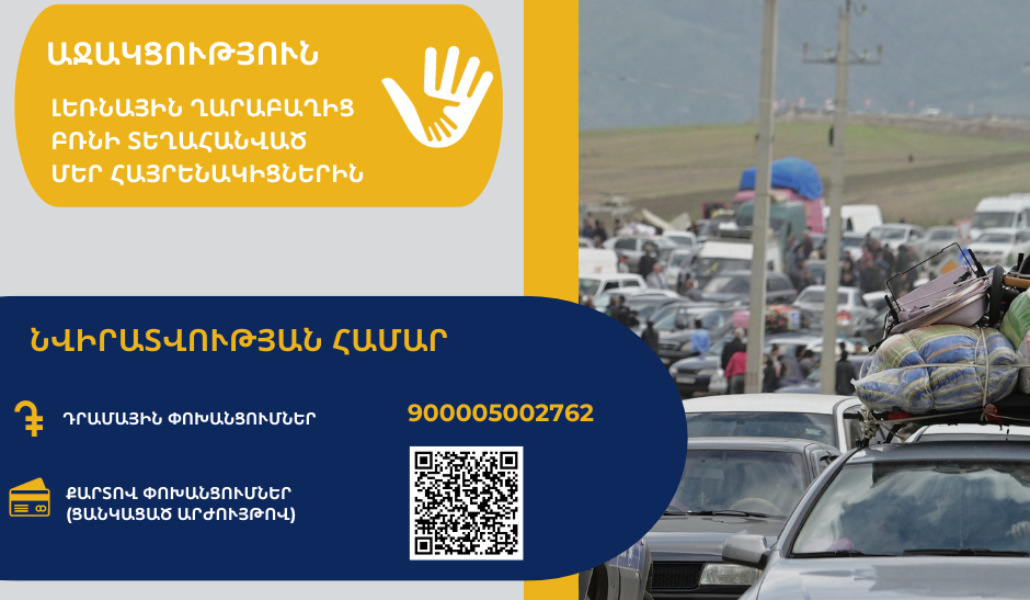 Отмечается, что в связи со сложившейся кризисной ситуацией проживающие в Армении и за рубежом многие соотечественники и организации выразили желание оказать помощь и пожертвования, направленные на обеспечение первоочередных потребностей вынужденных переселенцев из Нагорного Карабаха в Республику Армения.