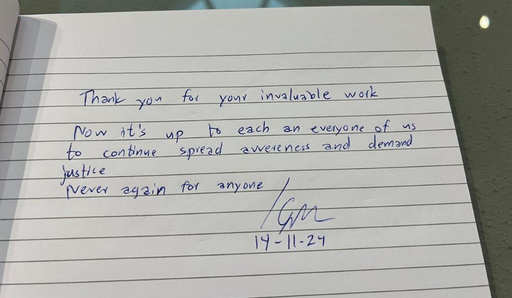 Затем Грета Тунберг сделала запись в Книге почетных гостей: «Спасибо за ваш бесценный труд. Теперь каждый из нас должен продолжать распространять информацию и требовать справедливости. Никогда больше, и это касается всех».